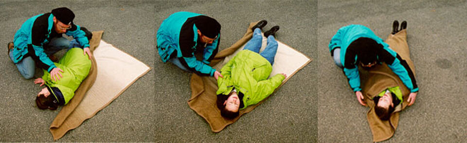 • Betroffenen wieder auf den Rücken drehen und den Wulst unter dem Körper hervorziehen. Hierfür den Körper des Betroffenen ggf. leicht anheben.